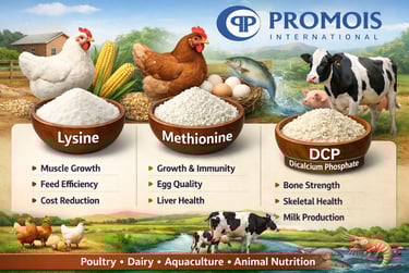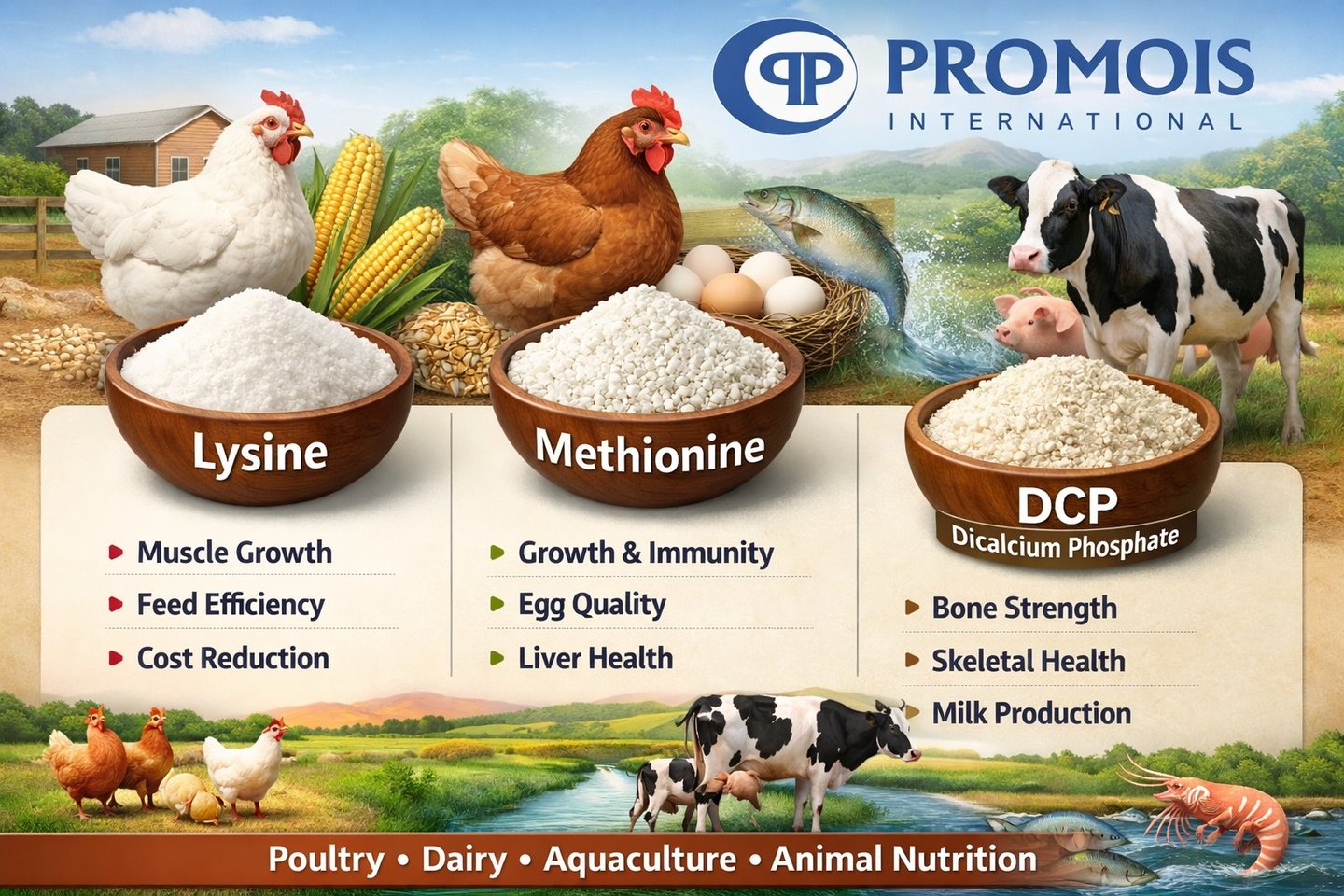 Lysine, Methionine, and DCP (Dicalcium Phosphate)—commonly used for animal feed, poultry, dairy, aquaculture, and premix markets: