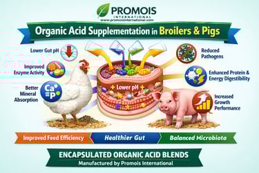 Organic acid supplements are widely used in poultry and swine nutrition to enhance nutrient digestibility and absorption efficiency. These acids, such as formic, lactic, and citric acid, lower gastrointestinal pH, creating an environment that favours beneficial microbial populations and inhibits pathogenic bacteria (Davis et al., 2013). The reduction in gut pH improves enzymatic activity, leading to increased breakdown of nutrients, particularly proteins and carbohydrates (Gadde et al., 2017). Organic acids also enhance the solubilization of minerals like calcium and phosphorus, facilitating better mineral absorption (Li et al., 2018). In broilers, supplementation has been shown to improve feed conversion ratios and growth performance due to improved nutrient utilization (Khan et al., 2019). Similarly, in pigs, organic acids have been reported to improve digestibility of crude protein and energy, contributing to better growth rates (Ramalho et al., 2015). The antimicrobial effect of organic acids reduces gut pathogen load, which otherwise impairs nutrient absorption, thereby indirectly promoting nutrient uptake (Mroz et al., 2010). Organic acids may also influence the structure and function of the intestinal mucosa, increasing surface area for absorption (Selle et al., 2016). Additionally, they can modify the gut microbiota composition, favouring beneficial bacteria that assist in nutrient fermentation and absorption (Gao et al., 2019). Organic acid supplementation appears to significantly enhance nutrient digestibility and absorption efficiency in broilers and pigs, leading to improved growth performance and feed efficiency (Yin et al., 2020).